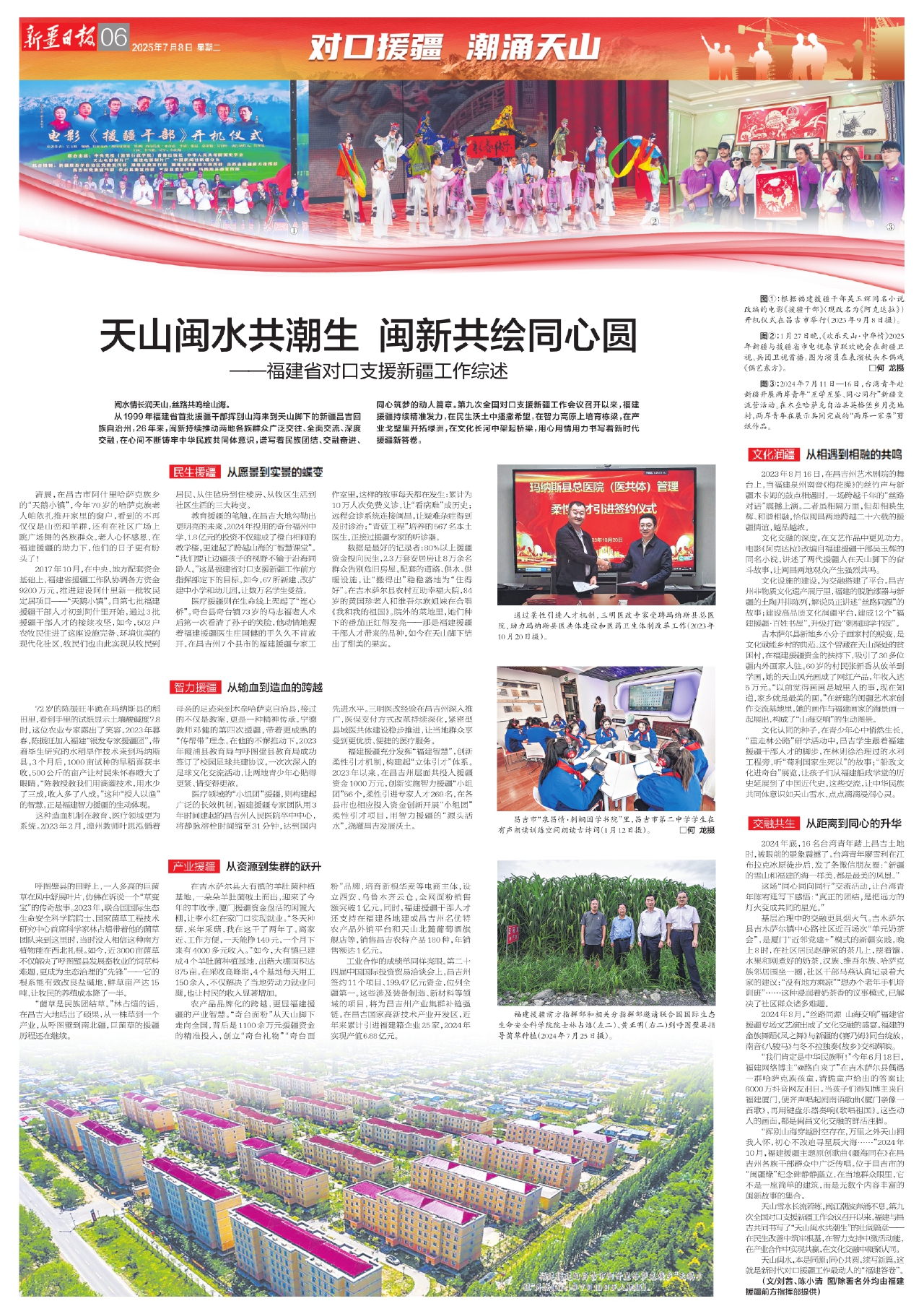 从1999年福建省首批援疆干部挥别山海来到天山脚下的新疆昌吉回族自治州,26年来,闽新持续推动两地各族群众广泛交往、全面交流、深度交融,在心间不断铸牢中华民族共同体意识,谱写着民族团结、交融奋进、同心筑梦的动人篇章。第九次全国对口支援新疆工作会议召开以来,福建援疆持续精准发力,在民生沃土中播撒希望,在智力高原上培育栋梁,在产业戈壁里开拓绿洲,在文化长河中架起桥梁,用心用情用力书写着新时代援疆新答卷。