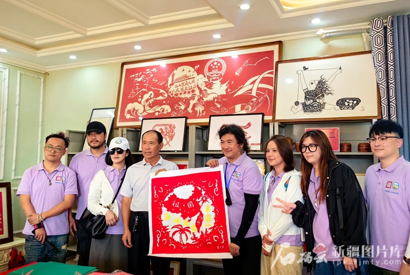 2024年7月11日—16日,台湾青年赴新疆开展两岸青年“互学互鉴、同心同行”新疆交流营活动。在木垒哈萨克自治县英格堡乡月亮地村,两岸青年在展示共同完成的“两岸一家亲”剪纸作品。