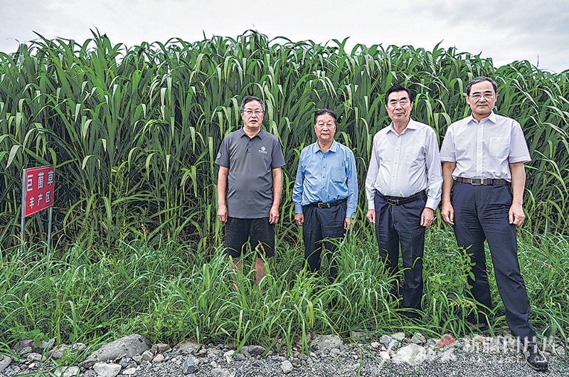 福建援疆前方指挥部和相关分指挥部邀请联合国国际生态生命安全科学院院士林占熺(左二)、黄正明(右二)到呼图壁县指导菌草种植(2024年7月25日摄)。