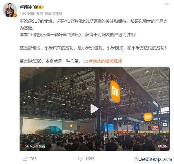 此前一天,小米集团合伙人、总裁卢伟冰也引用了莫言的这句名言。卢伟冰称:“不论是SU7的卖爆,还是YU7获得比SU7更高的关注和期待,都是以强大的产品力为基础。本着十倍投入做一辆好车的决心,获得千万网友的严选而胜出!还是那句话,小米汽车的成功,是小米价值观,小米模式,和小米方法论的成功!莫言说:诋毁,本身就是一种仰望。”