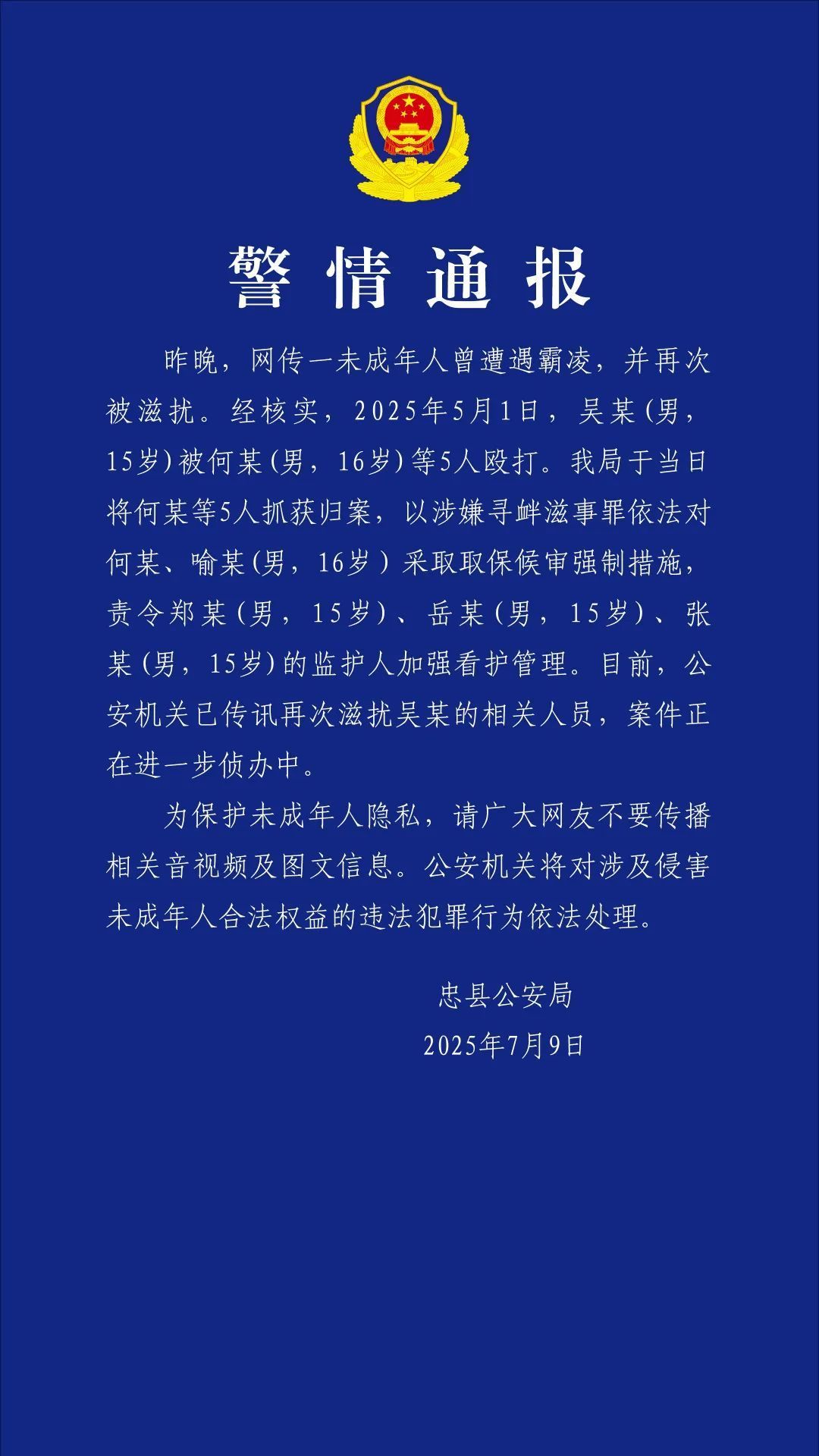 为保护未成年人隐私,请广大网友不要传播相关音视频及图文信息。公安机关将对涉及侵害未成年人合法权益的违法犯罪行为依法处理。