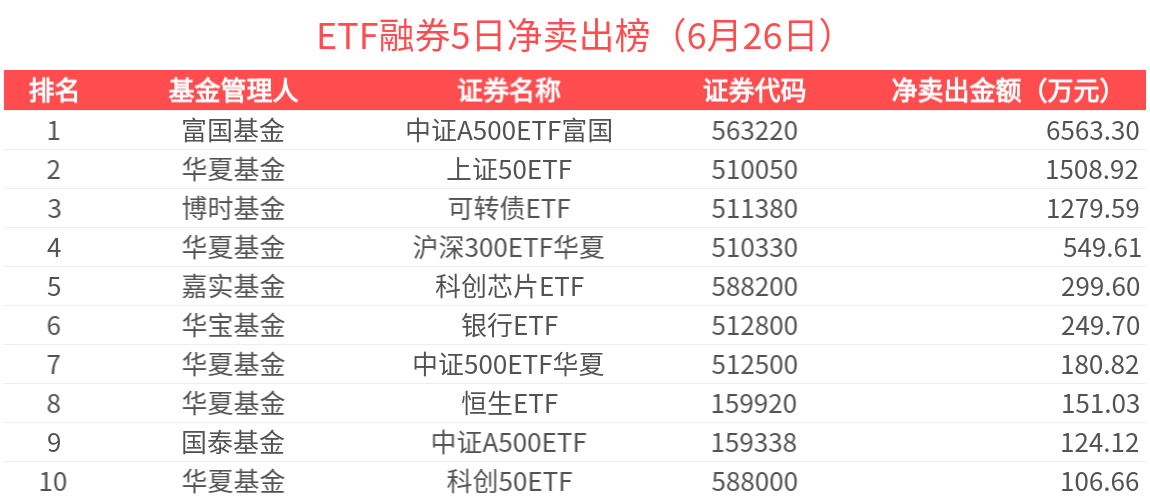 拉长时间看,近5天获杠杆资金融券净卖出超过500万元的有4只,金额居前的为中证A500ETF富国、上证50ETF、可转债ETF、沪深300ETF华夏等,分别净流出6563.30万元、1508.92万元、1279.59万元、549.61万元。其中,中证A500ETF富国近5天获杠杆资金大幅融券净卖出,达到成交额的1.26%。