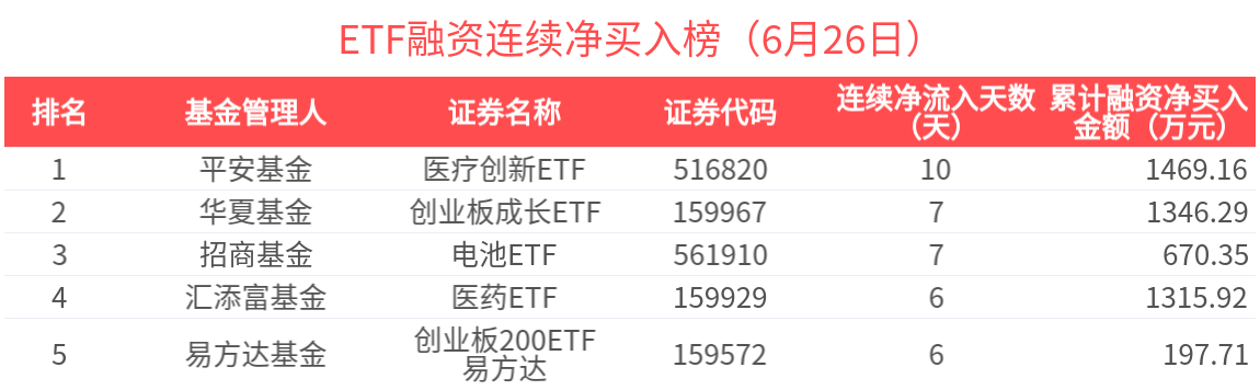 近期获杠杆资金连续融资净买入的ETF基金有84只,居前的为医疗创新ETF(10天)、创业板成长ETF(7天)、电池ETF(7天)、医药ETF(6天)、创业板200ETF易方达(6天)等,分别净买入1469.16万元、1346.29万元、670.35万元、1315.92万元、197.71万元。其中,创业板200ETF易方达近6天获杠杆资金加速买入,近6天杠杆资金累计流入197.71万元。
