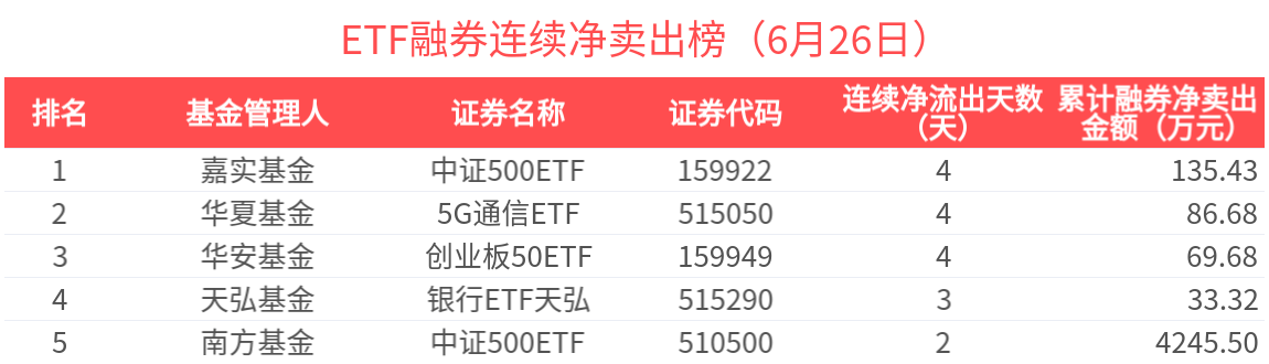 近期获杠杆资金连续融券净卖出的ETF基金有11只,居前的为中证500ETF(4天)、5G通信ETF(4天)、创业板50ETF(4天)、银行ETF天弘(3天)、中证500ETF(2天)等,分别净卖出135.43万元、86.68万元、69.68万元、33.32万元、4245.50万元。其中,中证500ETF近2天获杠杆资金加速流出,近2天杠杆资金累计流出4245.50万元。