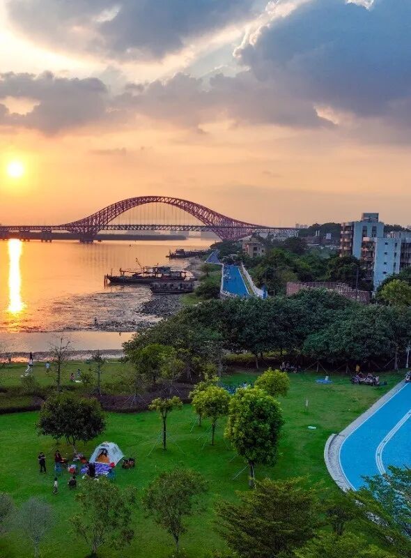 露营区的串灯如星辰般亮起,与远处明珠湾大桥璀璨的灯光带交相辉映,铺陈开一片宁静而温暖的底色。