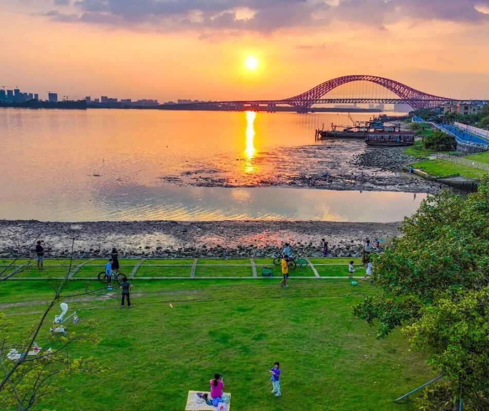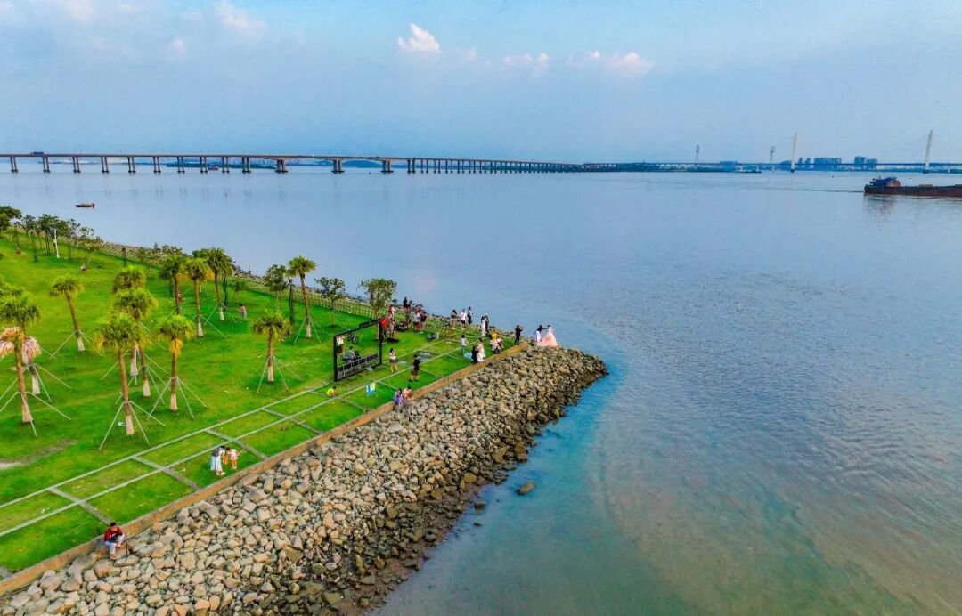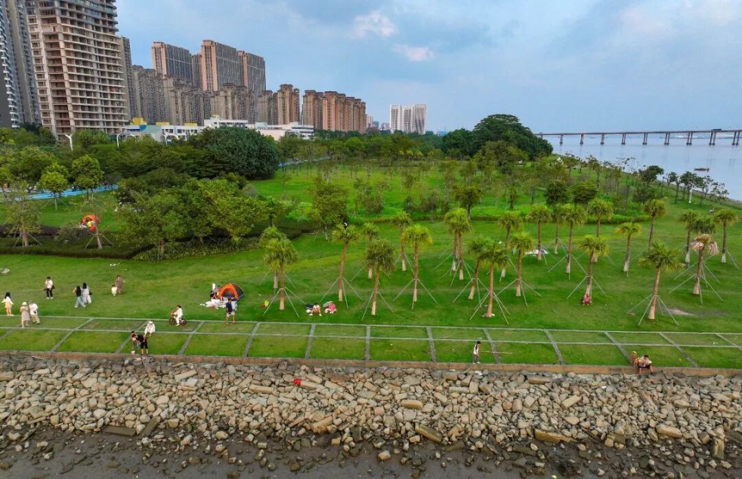 潮水刚刚退去,裸露的滩涂上留着波浪的纹路,孩子们奔跑嬉戏,寻找着贝壳与小蟹的踪迹。草地上,露营的帐篷点缀其间,骑行爱好者们的身影在绿道上穿梭,构成了一幅动静相宜的滨海假日画卷。