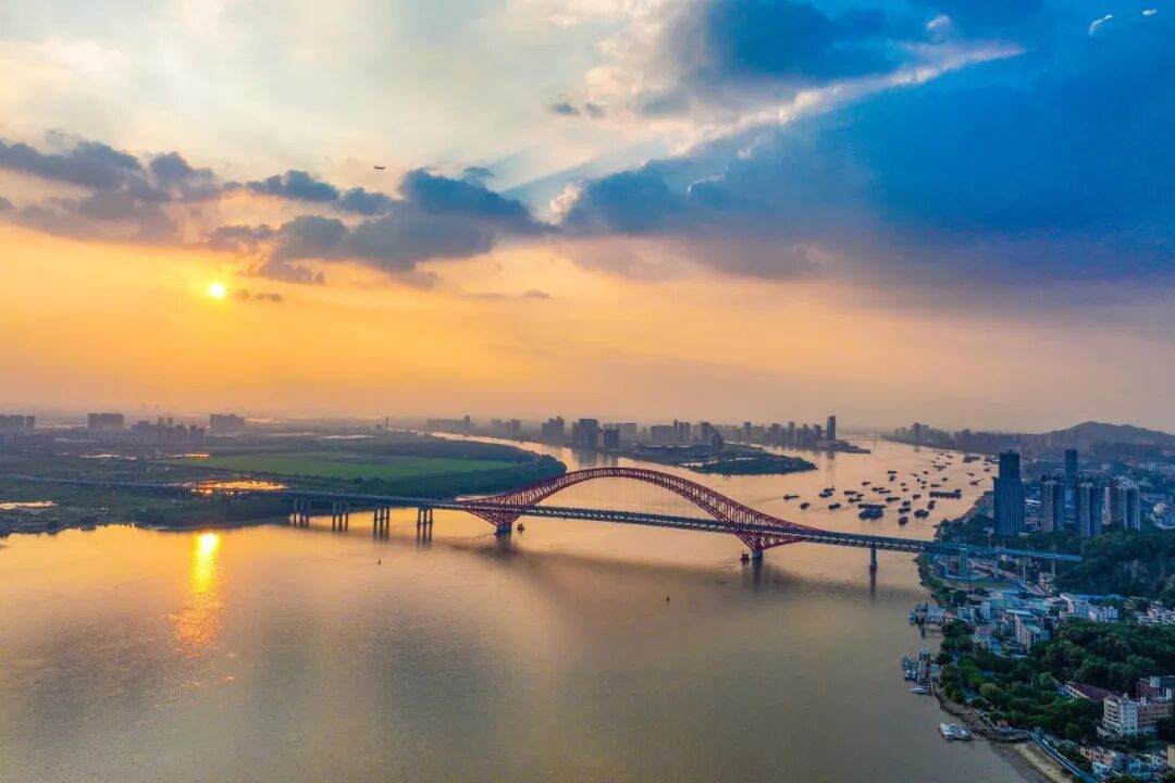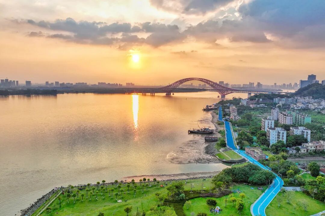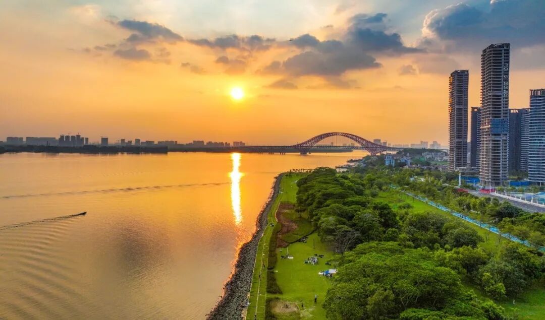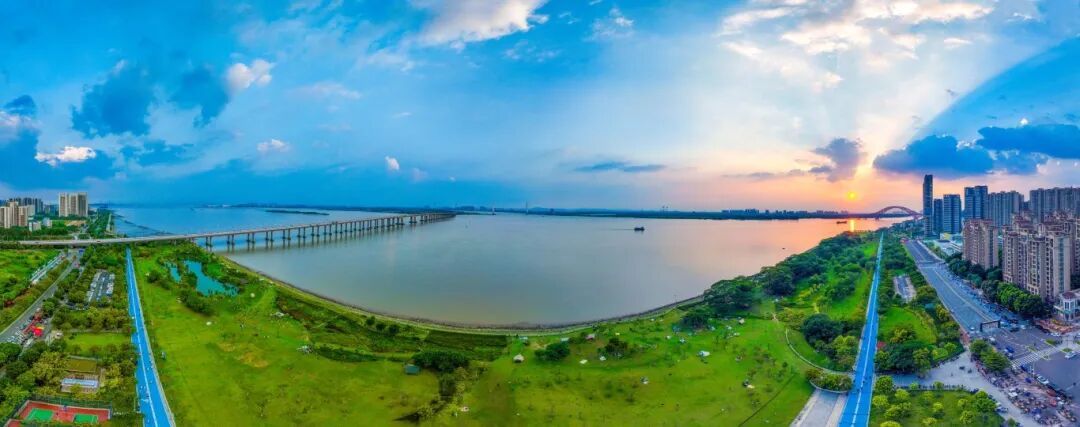 傍晚,夕阳熔金,暮云合璧。最后一缕阳光穿透云层,为绵长的海岸线、广阔的滩涂与现代化的南沙明珠湾大桥、凫洲大桥披上了一层温暖的滤镜。